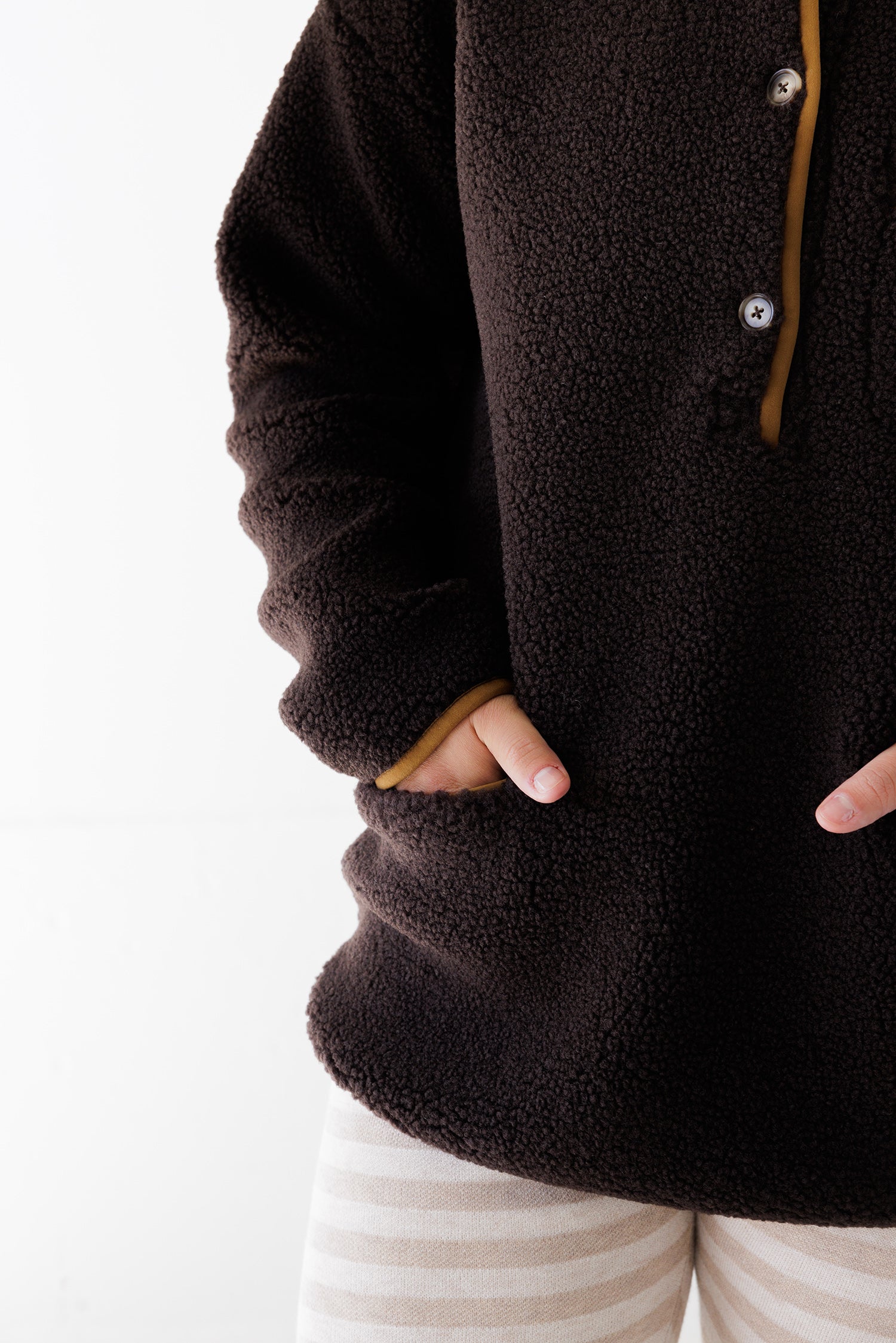 Relaxed fit, half placket fleece pullover with button closure, three panel hood, drop shoulder silhouette, contrast single welt chest pocket with hook and loop closure, double welt hand pockets with contrast elastic binding, jersey lined pocket bags, contrast elastic binding at hood, placket, sleeve and bottom opening.