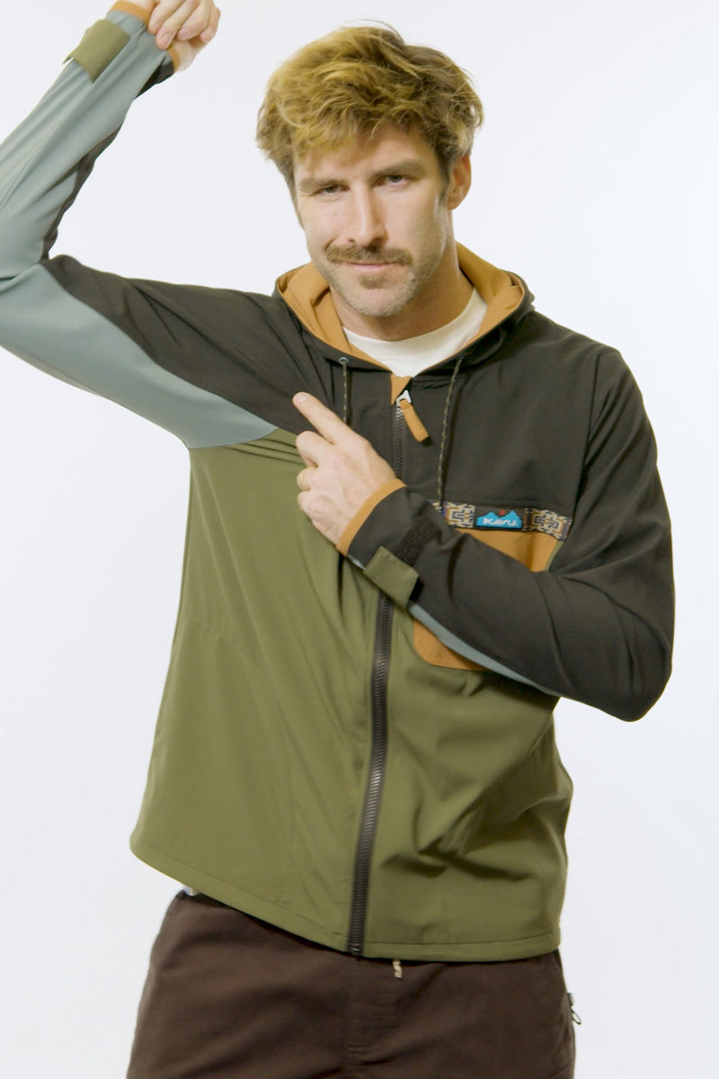 Casual fit, full zip light weight jacket, three panel hood with drawcord and logo printed aglets, interior self-fabric neck tape, front chest pocket with patterned webbing detail and hook and loop closure, mesh lined hand pockets, gusseted underarms, back drop tailed hem and bungee cord with cinch lock.