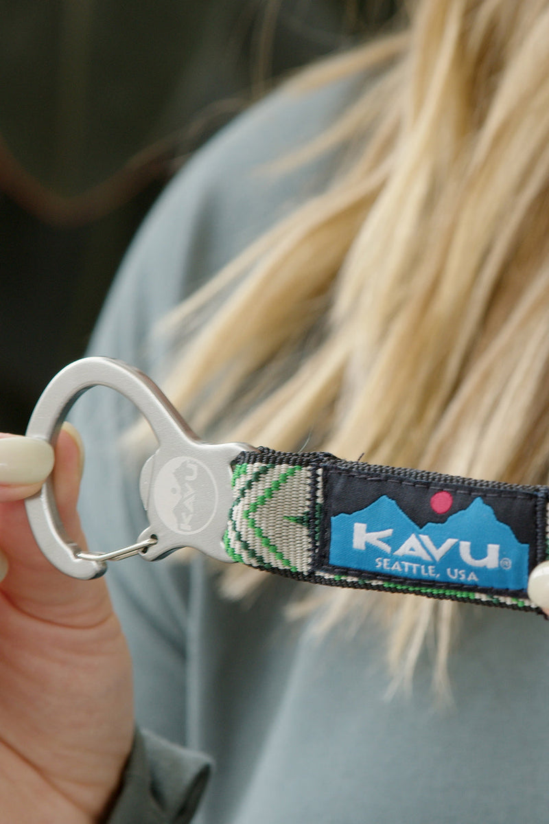 1" wide patterned tubular webbing key chain with aluminum bottle opener carabiner.