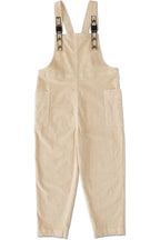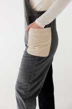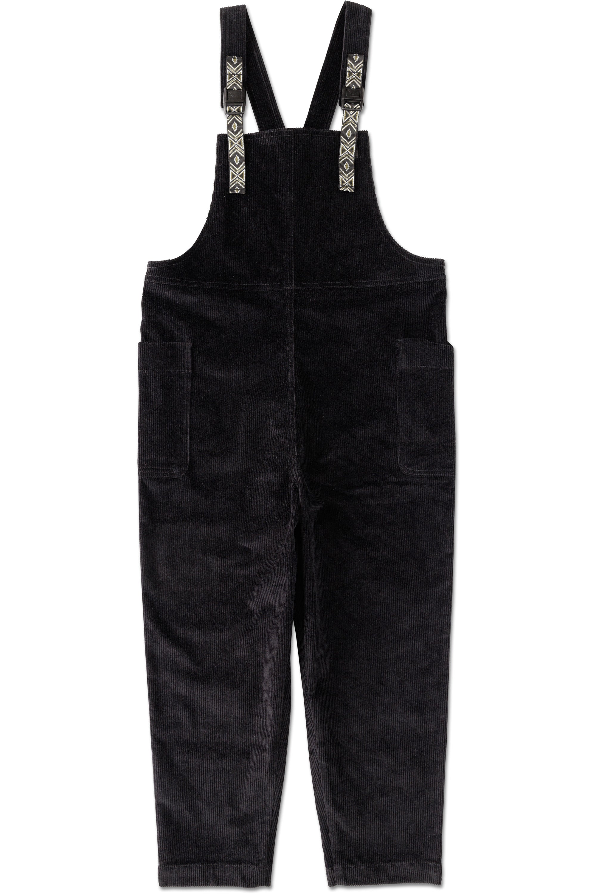Easy, relaxed fit, cropped jumpsuit with adjustable webbing shoulder straps and buckle closure, two side patch pockets.